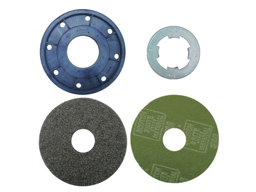 パッド台+4ツ爪プレート、剥離用黒パッド1枚、洗浄用緑パッド1枚。摩擦の少ないフラットな床面のみ使用可能。